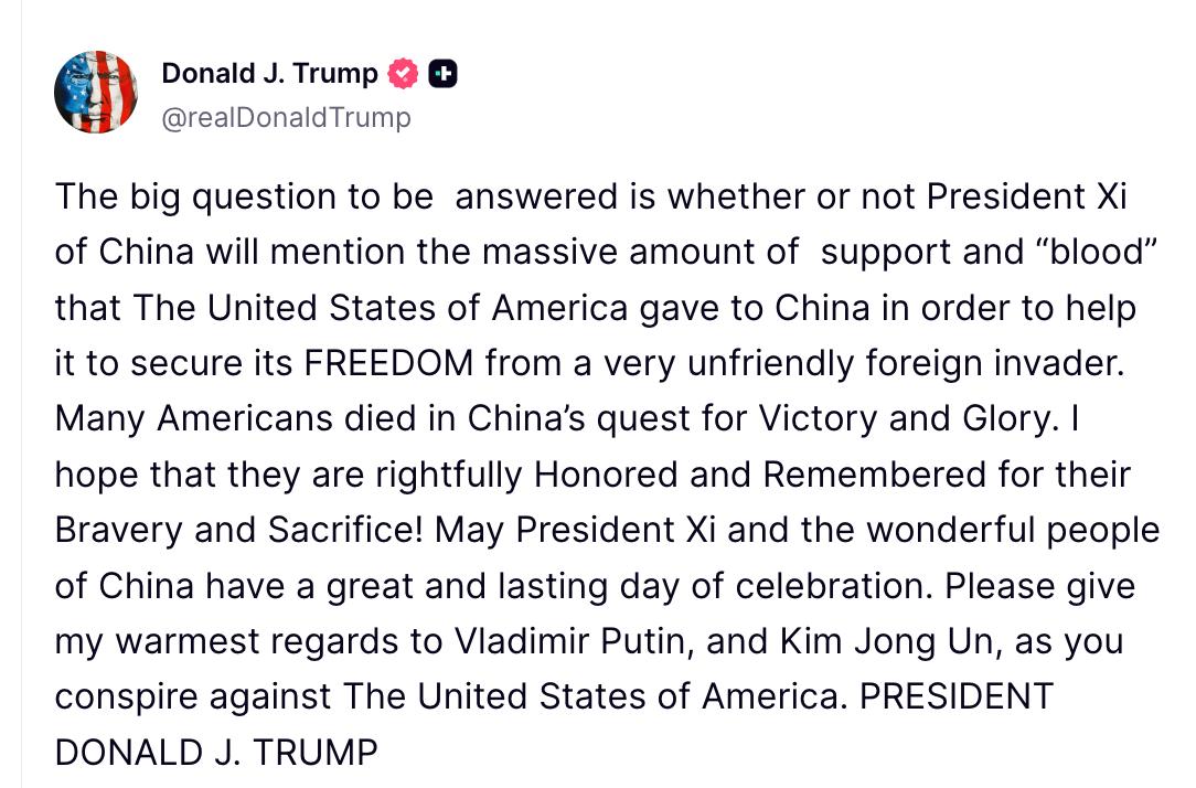 "Большой вопрос заключается в том, упомянет ли председатель Си из Китая ту огромную поддержку и ту "кровь", которую Соединённые Штаты Америки отдали Китаю, чтобы помочь ему завоевать свободу от очень недружественного иностранного захватчика. Многие американцы погибли в стремлении Китая к Победе и Славе. Я надеюсь, что они будут по праву Почтены и Помянуты за свою Храбрость и Жертву! Пусть председатель Си и замечательный народ Китая проведут великий и памятный день празднования. Передайте, пожалуйста, мои самые тёплые пожелания Владимиру Путину и Ким Чен Ыну, пока вы плетете заговор против Соединённых Штатов Америки", - написал президент США.