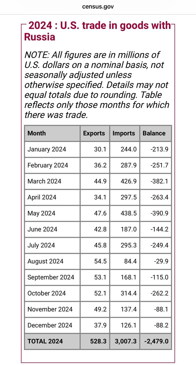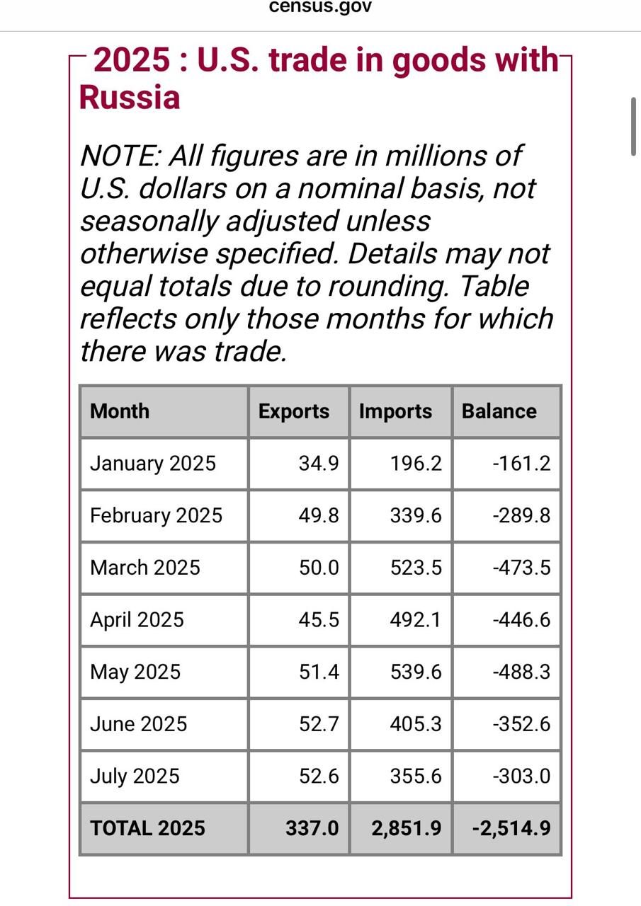Судя по приведенной им статистике, с января по июль текущего года (то есть за семь месяцев) Штаты ввезли из России товаров на 2,85 миллиарда долларов. Аналогичная сумма - 3 млрд - была за весь прошлый год.