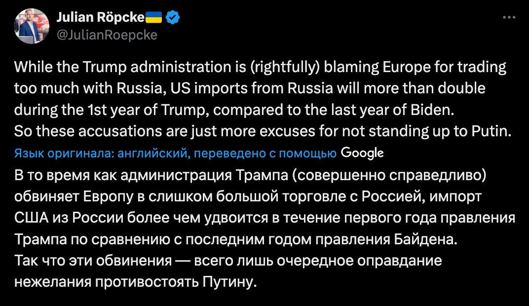"В то время как администрация Трампа (справедливо) обвиняет Европу в слишком больших объемах торговли с Россией, импорт США из России более чем удвоится в течение первого года правления Трампа по сравнению с последним годом Байдена. Так что эти обвинения — лишь очередные оправдания нежелания противостоять Путину", - сказано в публикации Рёпке.