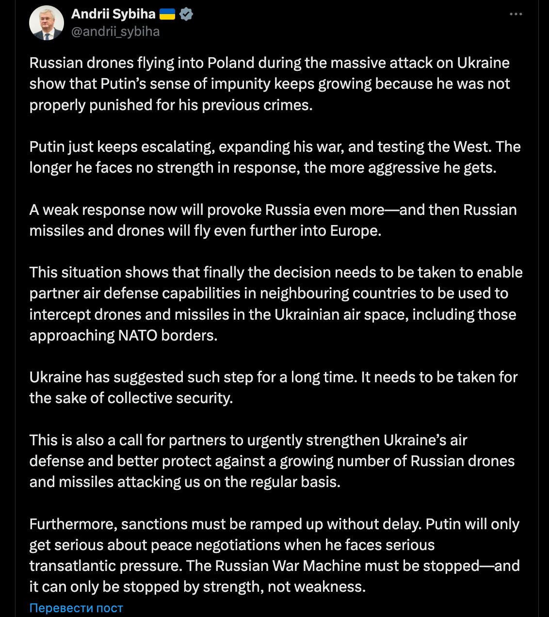 "Слабый ответ сейчас еще больше спровоцирует Россию, и тогда российские ракеты и беспилотники полетят еще дальше в глубь Европы. Эта ситуация показывает, что необходимо, наконец, принять решение о возможности использования возможностей ПВО партнеров в соседних странах для перехвата беспилотников и ракет в воздушном пространстве Украины, в том числе приближающихся к границам НАТО", - заявил министр.