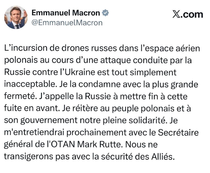 "Вторжение российских дронов в польское воздушное пространство во время атаки России против Украины совершенно неприемлемо. Я самым решительным образом это осуждаю. Призываю Россию прекратить этот безрассудный курс. Я вновь выражаю польскому народу и его правительству нашу полную солидарность. В ближайшее время я проведу беседу с генеральным секретарём НАТО Марком Рютте. Мы не будем идти на компромиссы в вопросах безопасности союзников", - написал французский президент в Х.