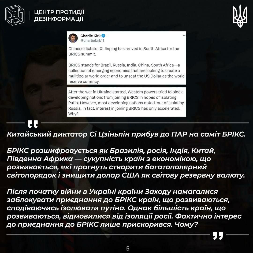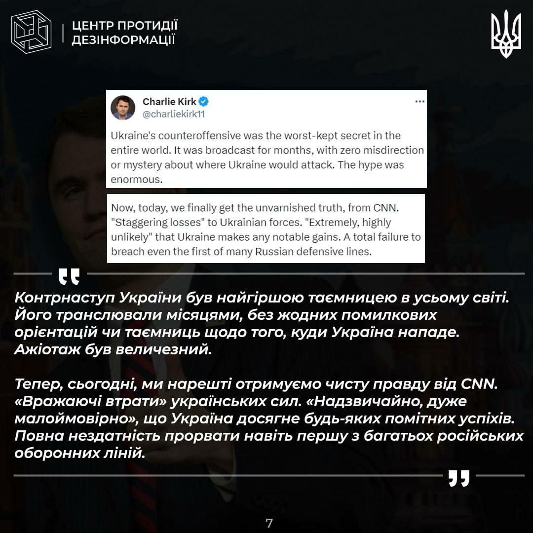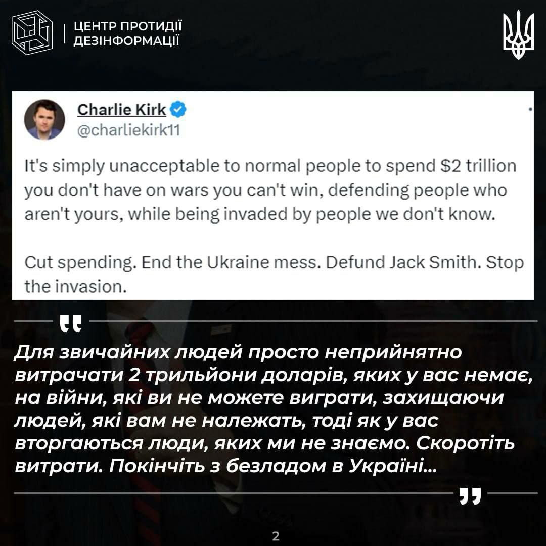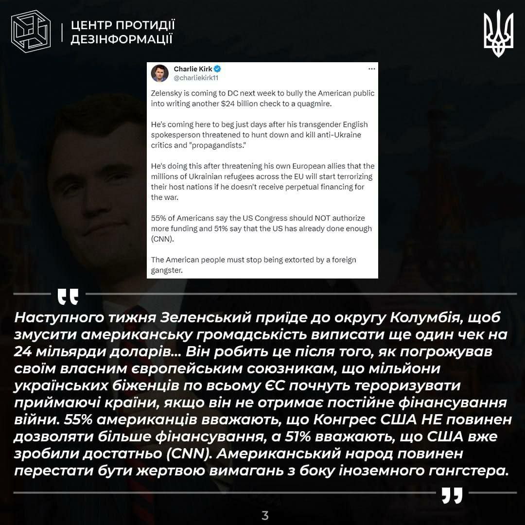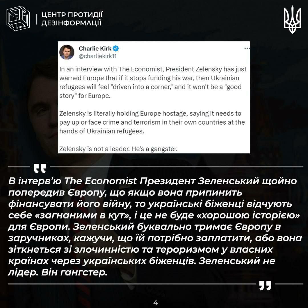 Утверждалось, что Чарли Кирк распространяет на Западе "тезисы российской пропаганды". Их примеры также приводит ЦПД. Там критикуется среди прочего президент Украины Владимир Зеленский, за то что он "получает чеки" у администрации Байдена.
