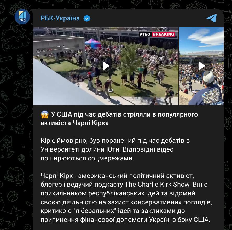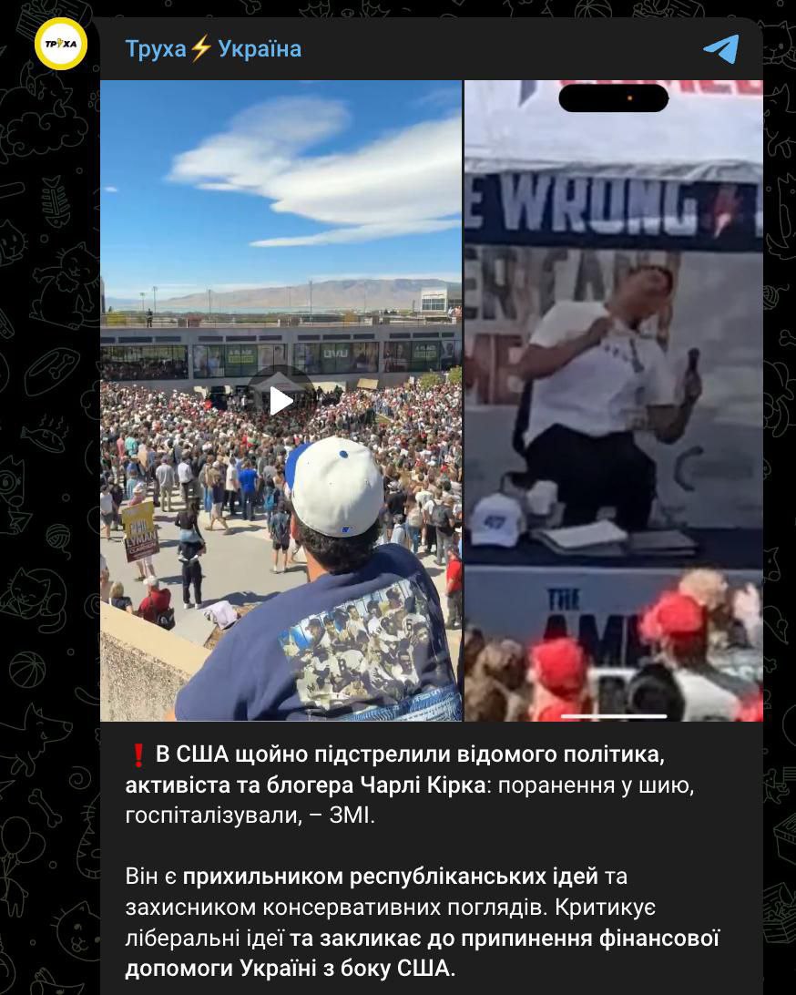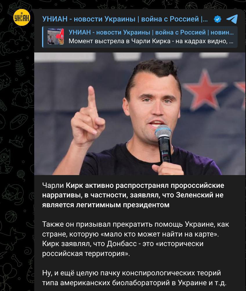 Украинские паблики и СМИ, рассказывая сегодня о покушении на Кирка, также упомянули его "антиукраинские" заявления.