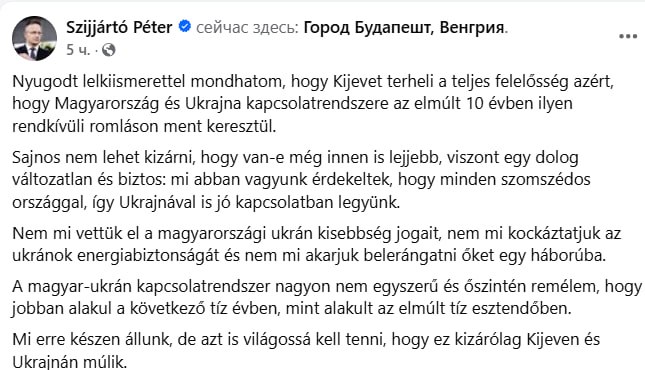 "С чистой совестью могу сказать, что Киев несет полную ответственность за то, что система отношений Венгрии и Украины за последние 10 лет пережила такое чрезвычайное ухудшение... Не мы отбирали права украинского меньшинства в Венгрии, не мы ставили под угрозу энергетическую безопасность украинцев и не мы хотели втянуть их в войну", – написал Сийярто.