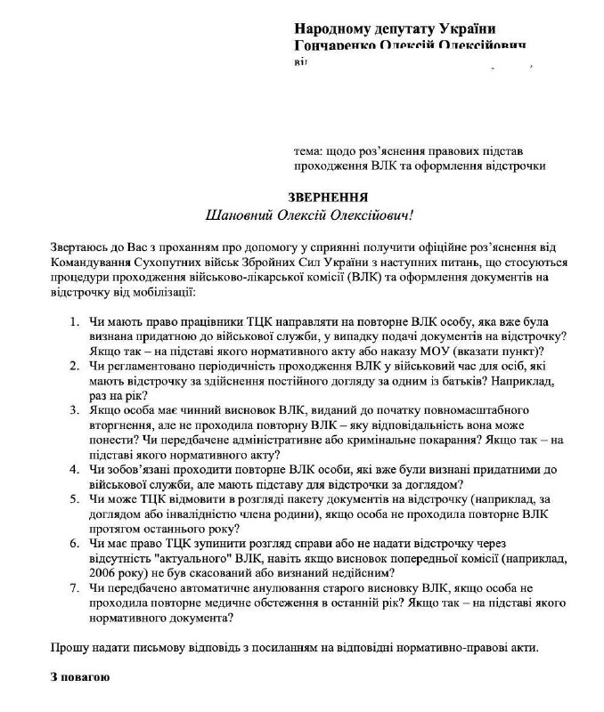 "Главное из этого ответа: если уже признали пригодным без ограничений, проходить ВВК ежегодно не нужно. Старая ВВК не аннулируется автоматически. Отказать в отсрочке из-за несвежих результатов ВВК не имеют права. Ответственности за непрохождение ВВК раз в год законом нет. Повторно направляют на ВВК только тех, кого сочли ограниченно или временно непригодными. Вывод прост: требования ТЦК делать новую ВВК каждый год – это злоупотребление. Закон этого не требует", - написал Гончаренко в своем телеграм-канале.