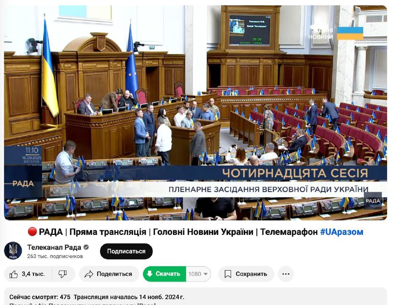 В момент написания новости Ютуб-канал "Рады" показывал пленарное заседание в рамках четырнадцатой сессии, а смотрели его чуть более 500 человек. При этом в сессионном зале находились до 50 депутатов.