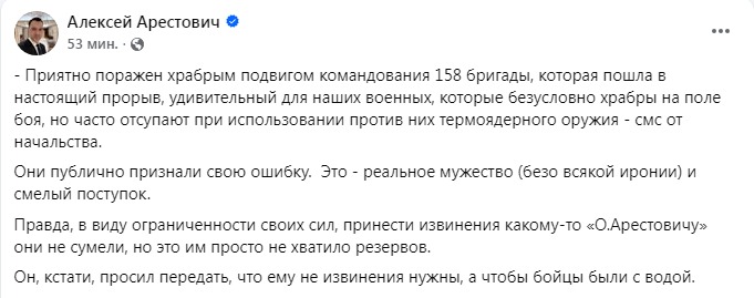 Они публично признали свою ошибку. Это - реальное мужество (безо всякой иронии) и смелый поступок. Правда, ввиду ограниченности своих сил принести извинения какому-то Арестовичу они не сумели, но это им просто не хватило резервов", - написал бывший советник Банковой.