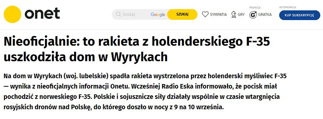 По данным портала Onet, ракету-перехватчик, упавшую на дом в Вырыках, вероятно, выпустил находившийся на дежурстве нидерландский истребитель F-35. То есть здание было разрушено в ходе оборонительной операции, проведенной польскими и союзными войсками после вторжения российских беспилотников в Польшу.