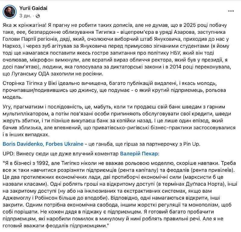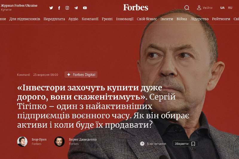 Бизнесмен впервые за долгое время дал большое интервью украинскому Forbes, посвященное инвестициям в послевоенную Украину, после чего на журналиста Бориса Давиденко, который общался с Тигипко, обрушились волны критики. Причина всплеска возмущения - работа банкира в прошлом вице-премьером во времена президентства Виктора Януковича и руководство его предвыборным штабом, а также его третий номер в предвыборном списке "Партии регионов".