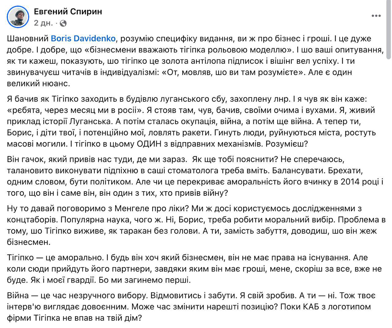 Автора интервью и главреда издания Давиденко начали обвинять в непатриотичности. Ему писали, что рекламировать Тигипко аморально и что как публичная личность банкир "не имеет права на существование".