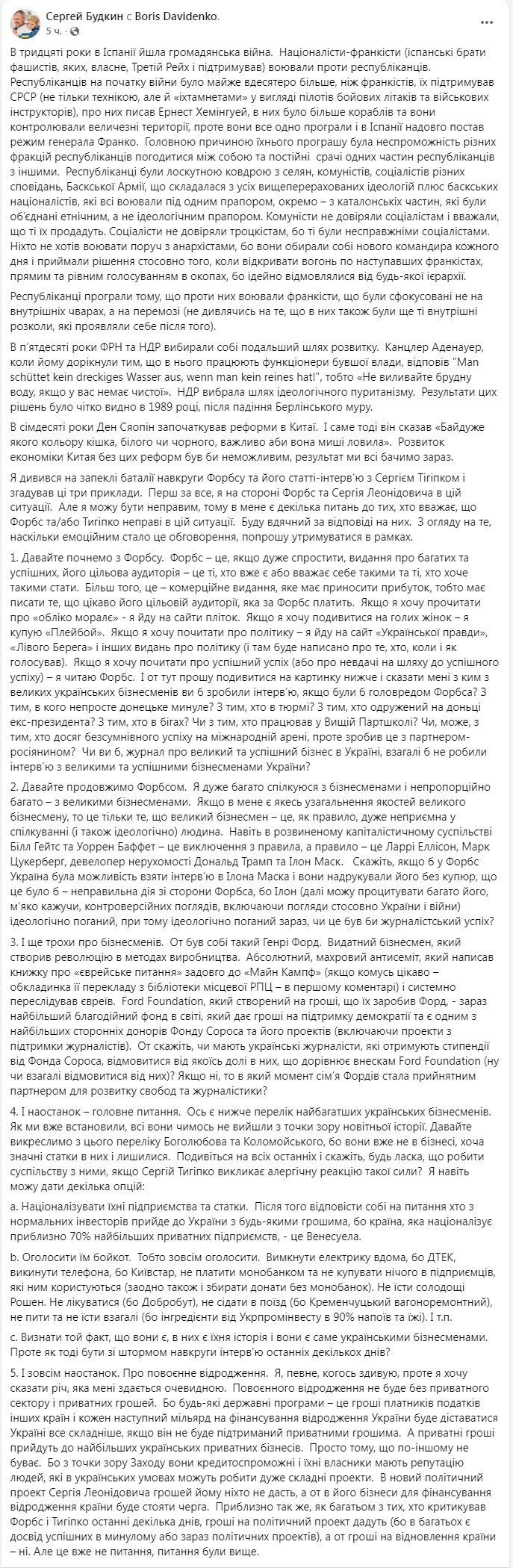 Его поддержали некоторые другие блогеры и бизнесмены. Они упрекнули критиков интервью в том, что те демонизируют украинских бизнесменов, чем подрывают послевоенные инвестиции в украинскую экономику.