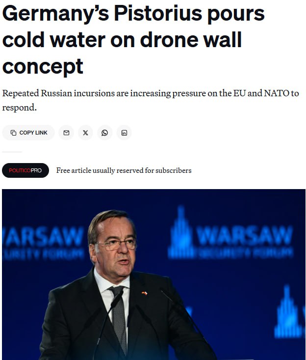 Издание пишет, что вопрос "стены из дронов" будет вынесен на повестку неформальной встречи европейских лидеров в Копенгагене в эту среду. Несмотря на осторожность по поводу переоценки проекта стены из дронов, министр обороны Нидерландов Рубен Брекелманс, выступая на той же панели, заявил, что ЕС и страны НАТО должны ускорить разработку и закупку технологий противодействия дронам.