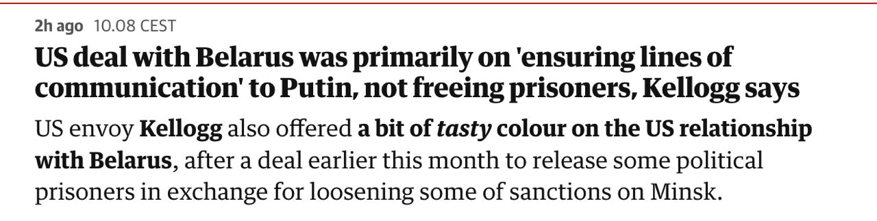 Спецпредставитель США по вопросам Украины и России Кит Келлог подтвердил, что Белый дом через президента Беларуси Александра Лукашенко ведет переговоры с главой Кремля Владимиром Путиным, и снятие санкций с Беларуси рассматривалось в этом ключе, а не для освобождения политических заключенных.