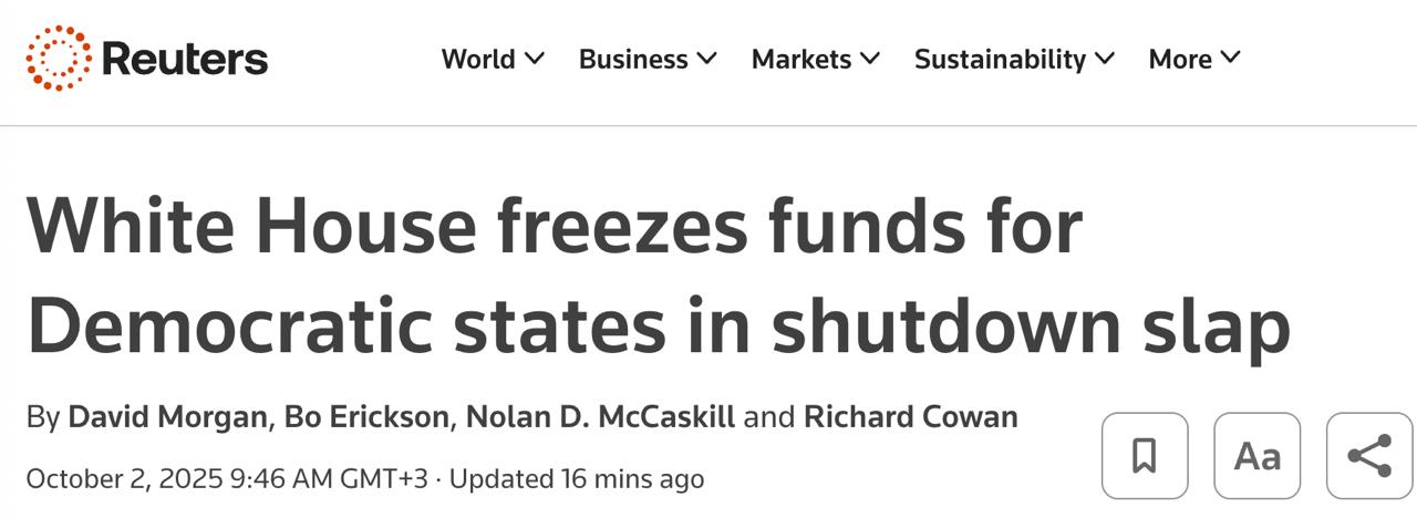 "Эти шаги ясно показали, что президент США Дональд Трамп намерен осуществить свою угрозу и воспользоваться приостановкой работы правительства, чтобы наказать своих политических оппонентов и расширить свой контроль над федеральным бюджетом в размере 7 триллионов долларов, который, согласно Конституции США, находится в ведении конгресса", - комментирует ситуацию Reuters.