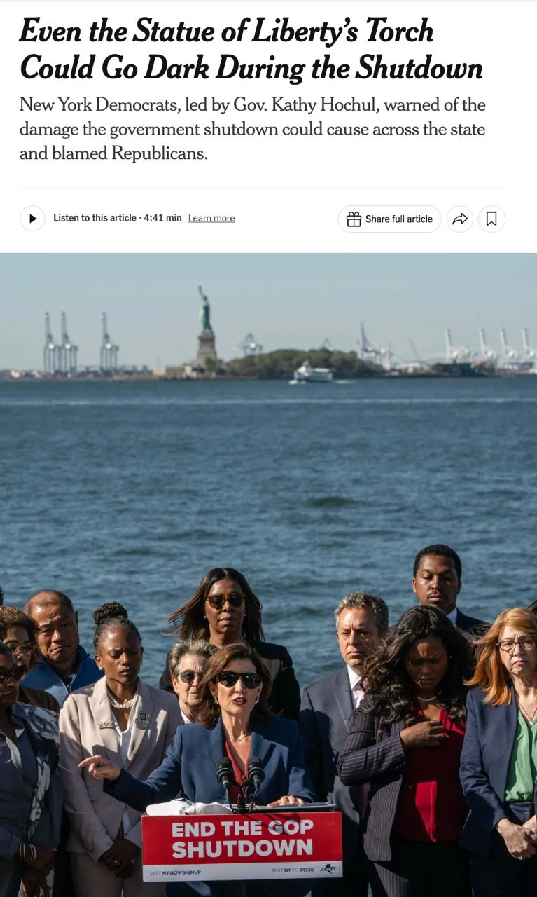 Также губернатор штата Нью-Йорк сказала, что последствия шатдауна уже начинают сказываться по всему региону: более 100 тысяч федеральных служащих были отправлены в неоплачиваемый отпуск или находятся под угрозой увольнения, включая десятки сотрудников статуи Свободы; авиадиспетчеры и сотрудники Управления транспортной безопасности работают без оплаты, а больницы тщетно ждут федеральных возмещений.