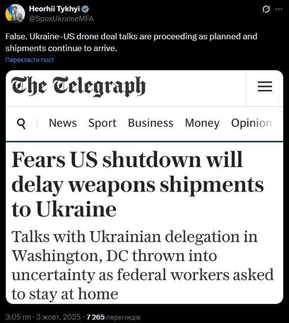 "Это неправда. Переговоры между Украиной и США по соглашению о БПЛА идут по плану, и поставки продолжают поступать", – написал Тихий.