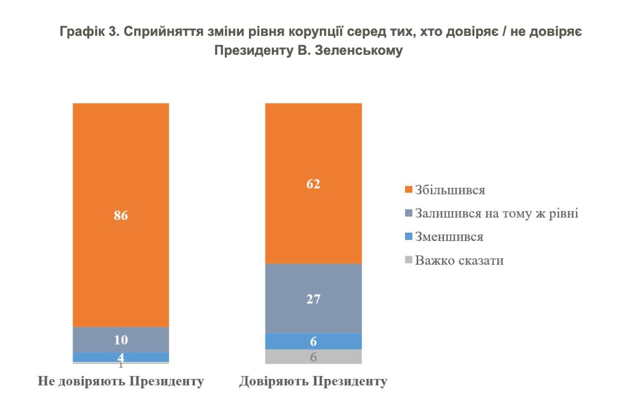 Среди тех опрошенных, кто доверяет президенту Украины Владимиру Зеленскому, только 6% считают, что коррупция в стране стала меньше.