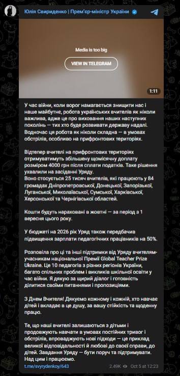 По словам Свириденко, во время войны роль учителя чрезвычайно важна – именно они формируют поколение, которое будет восстанавливать и развивать страну.