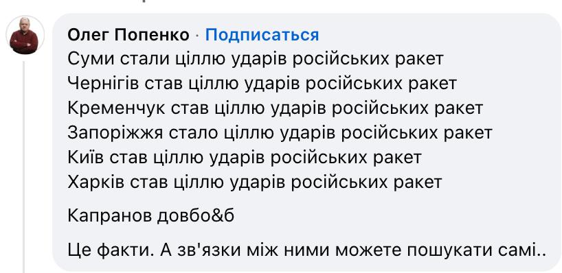 "Сумы стали целью ударов российских ракет. Чернигов стал целью ударов российских ракет. Кременчуг стал целью ударов российских ракет. Запорожье стало целью ударов российских ракет. Киев стал целью ударов российских ракет. Харьков стал целью ударов российских ракет. Капранов долбо@б. Это факты. А связи между ними можете поискать сами", - передразнил умозаключения писателя эксперт по ЖКХ и энергетике Олег Попенко.