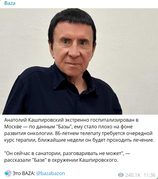 По их информации, 86-летний Кашпировский долгое время страдал от болей в брюшной полости, но отказывался обращаться к врачам за помощью. Он пытался вылечить рак своими методами, но это не помогло, его здоровье резко ухудшилось.