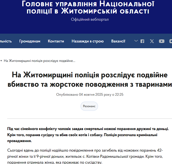 В селе Котовка Житомирской области мужчина зарезал жену, дочь, котов и собаку.