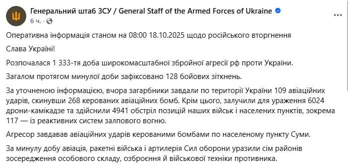Война в Украине идет 1333-й день. Мы следим за последними новостями субботы, 18 октября 2025 года, в обновляемом онлайне.