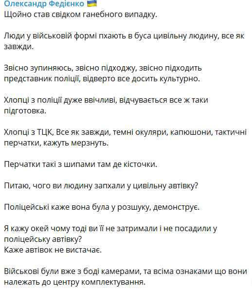 По словам нардепа, он стал свидетелем принудительной мобилизации: несколько человек в очках и капюшонах силой усадили мужчину в гражданский автомобиль, при этом на месте присутствовала полиция. Свой внешний вид сотрудники ТЦК объяснили тем, что мерзнут.