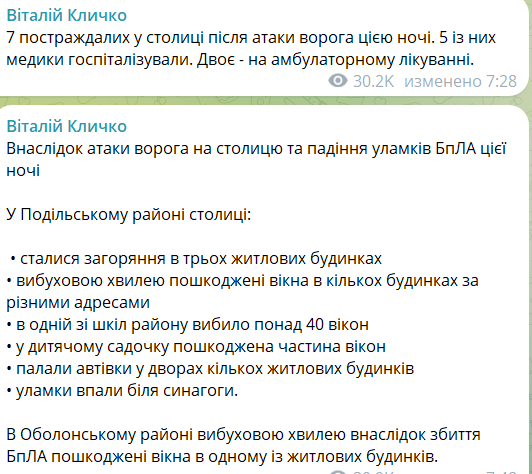 "Семь пострадавших в столице после атаки врага этой ночью. Пятеро из них госпитализированы медиками. Двое - на амбулаторном лечении", - написал он.