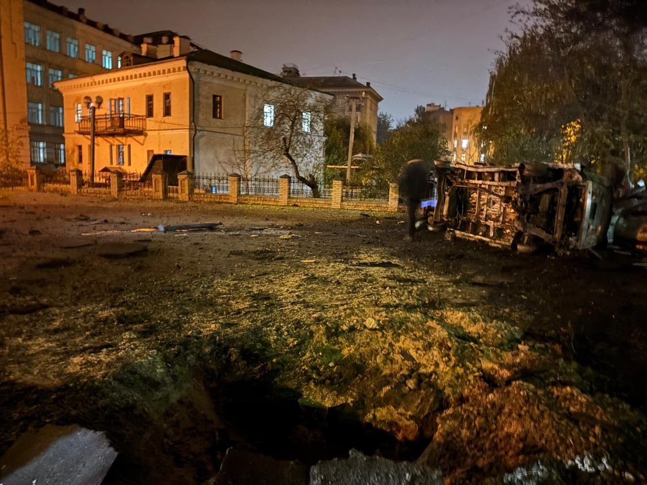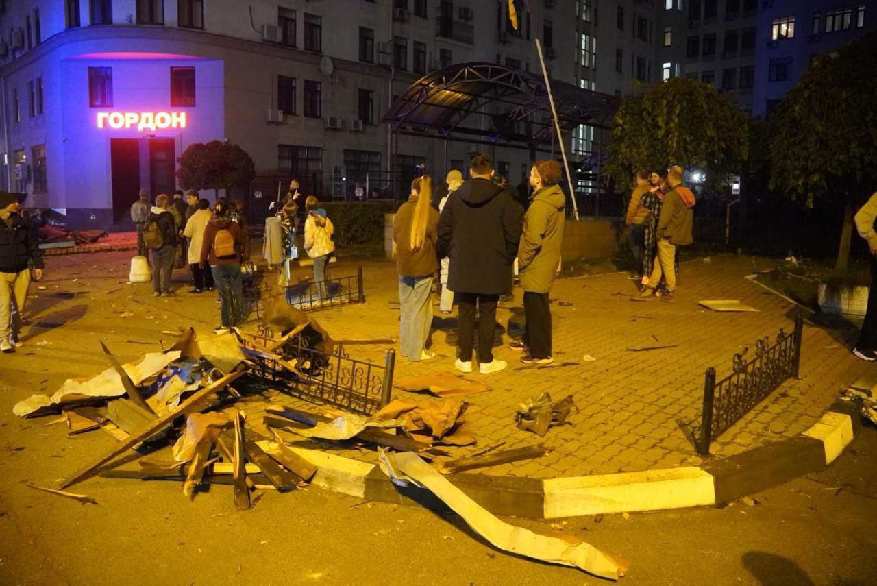 Кроме того, зафиксированы повреждения на территории детского сада: обломки дронов повредили фасад здания и выбили окна. Возгорания также произошли в складских помещениях, а один из бизнес-центров пострадал из-за падения обломков. Кличко уточнил, что обломки сбитого дрона упали возле синагоги.