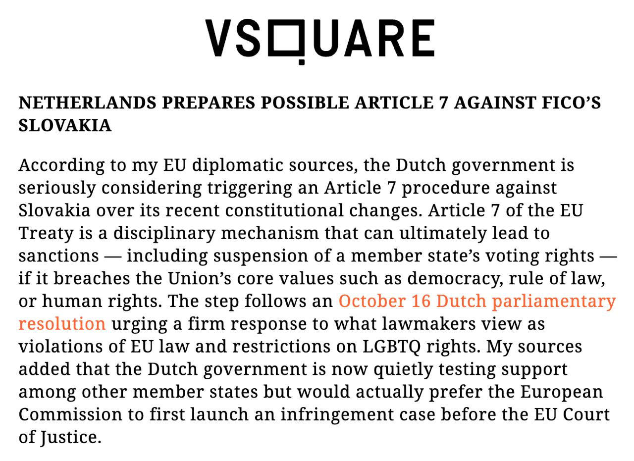 Правительство Нидерландов рассматривает инициирование в отношении Словакии дисциплинарной процедуры по седьмой статье Договора о Европейском Союзе в связи с тем, что Братислава внесла в конституцию изменения о признании только двух полов и запрет на усыновление детей вне брака.