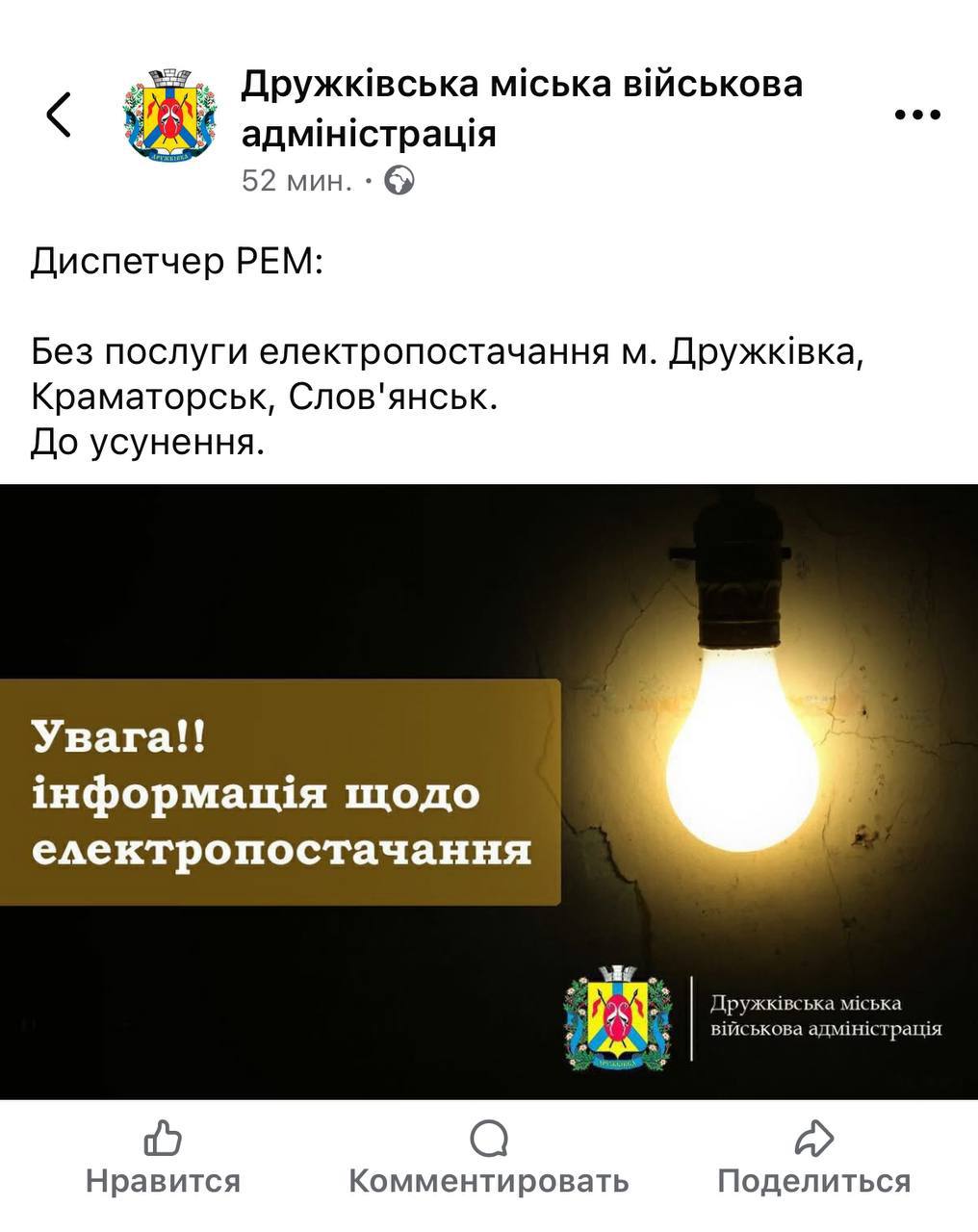 Ранее сообщалось об отключении света в Дружковке, Славянске и Краматорске.