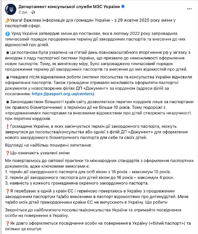 С 29 октября гражданам Украины, у которых истекает срок действия загранпаспорта, необходимо оформить новый биометрический документ - для себя и отдельно на детей, заявляет МИД.