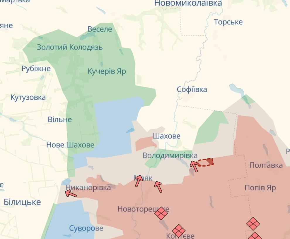 10:52 Армия РФ продвинулась около Волчанска и Владимировки, что южнее добропольского выступа, сообщает Deep State.