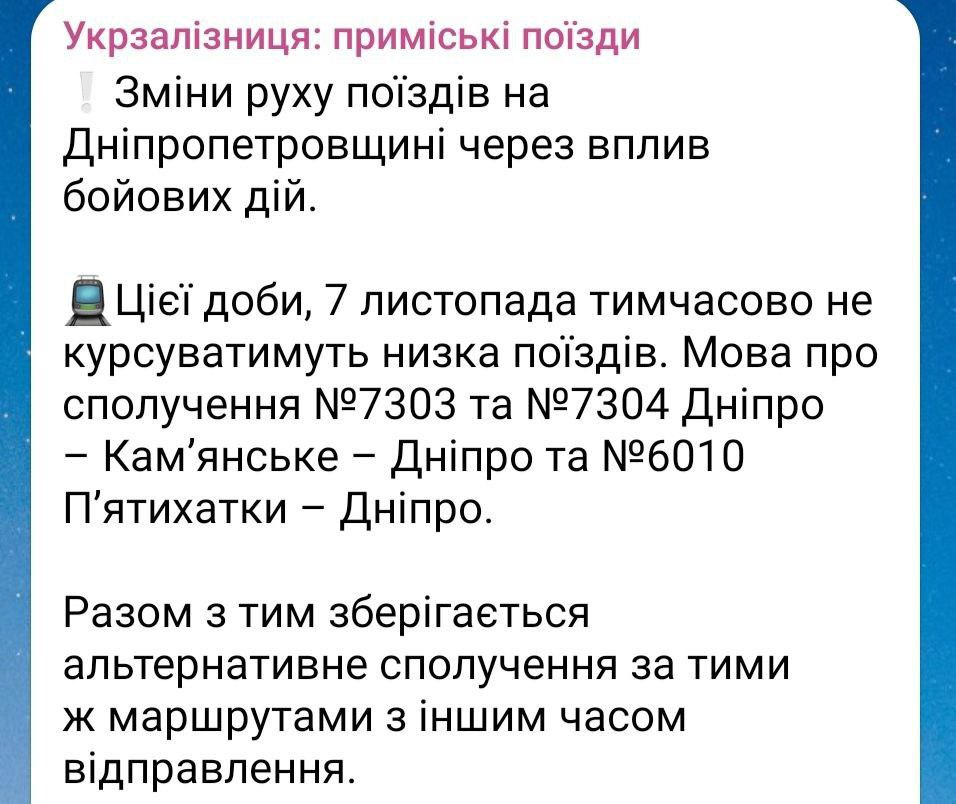 08:03 Из-за боевых действий "Укрзализныця" изменила движение поездов на Днепропетровщине. 7 ноября временно не будут курсировать поезда №7303 и №7304 Днепр – Каменское – Днепр и №6010 Пятихатки – Днепр.