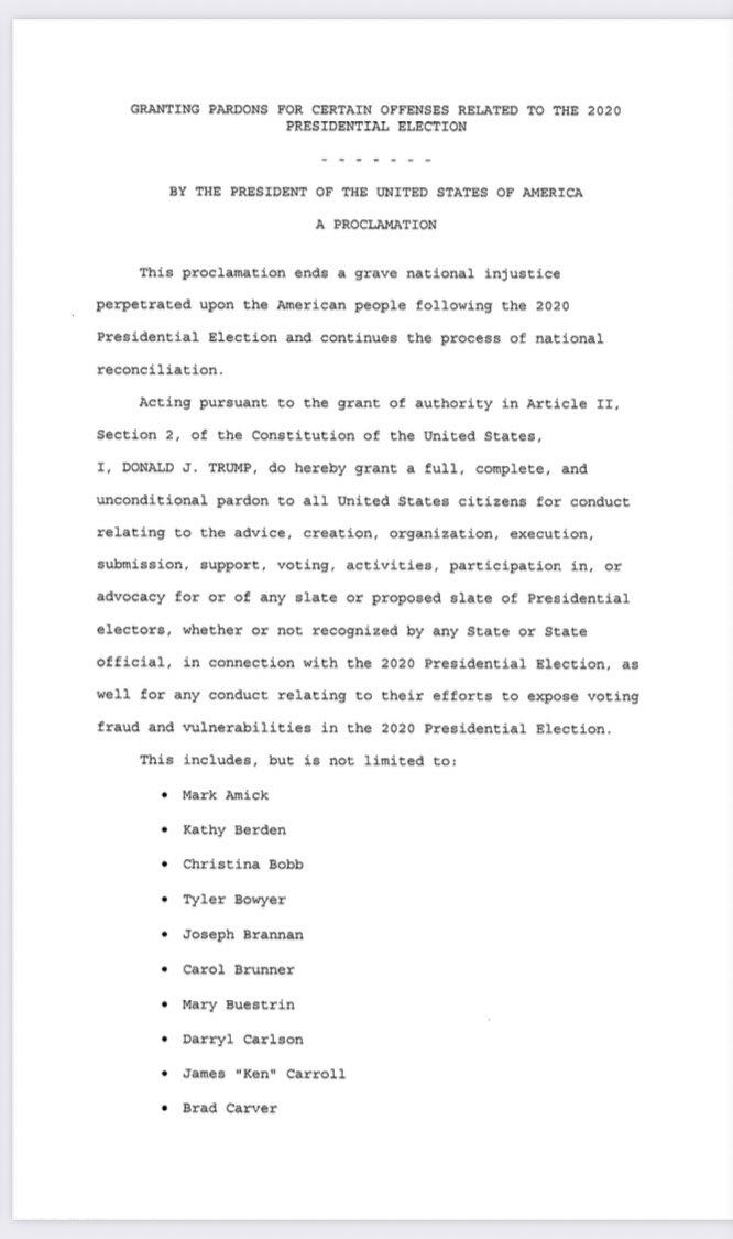 "Это официальное заявление положит конец серьезной национальной несправедливости, совершенной в отношении американского народа после президентских выборов 2020 года. Я, Дональд Трамп, настоящим объявляю полное, безоговорочное помилование всем гражданам США за действия, связанные с их усилиями по выявлению фальсификации при голосовании на президентских выборах 2020 года", — сказано в тексте документа.