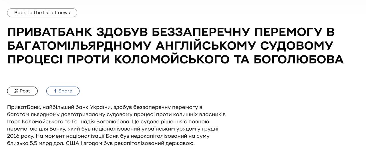 Сегодня Высокий суд Англии постановил, бывшие владельцы "Приватбанка" Игорь Коломойский и Геннадий Боголюбов обязаны выплатить финучреждению свыше 3 миллиардов долларов в виде возмещения ущерба и судебных издержек после того, как в июле этого года их признали виновными в совершении масштабного мошенничества против банка.