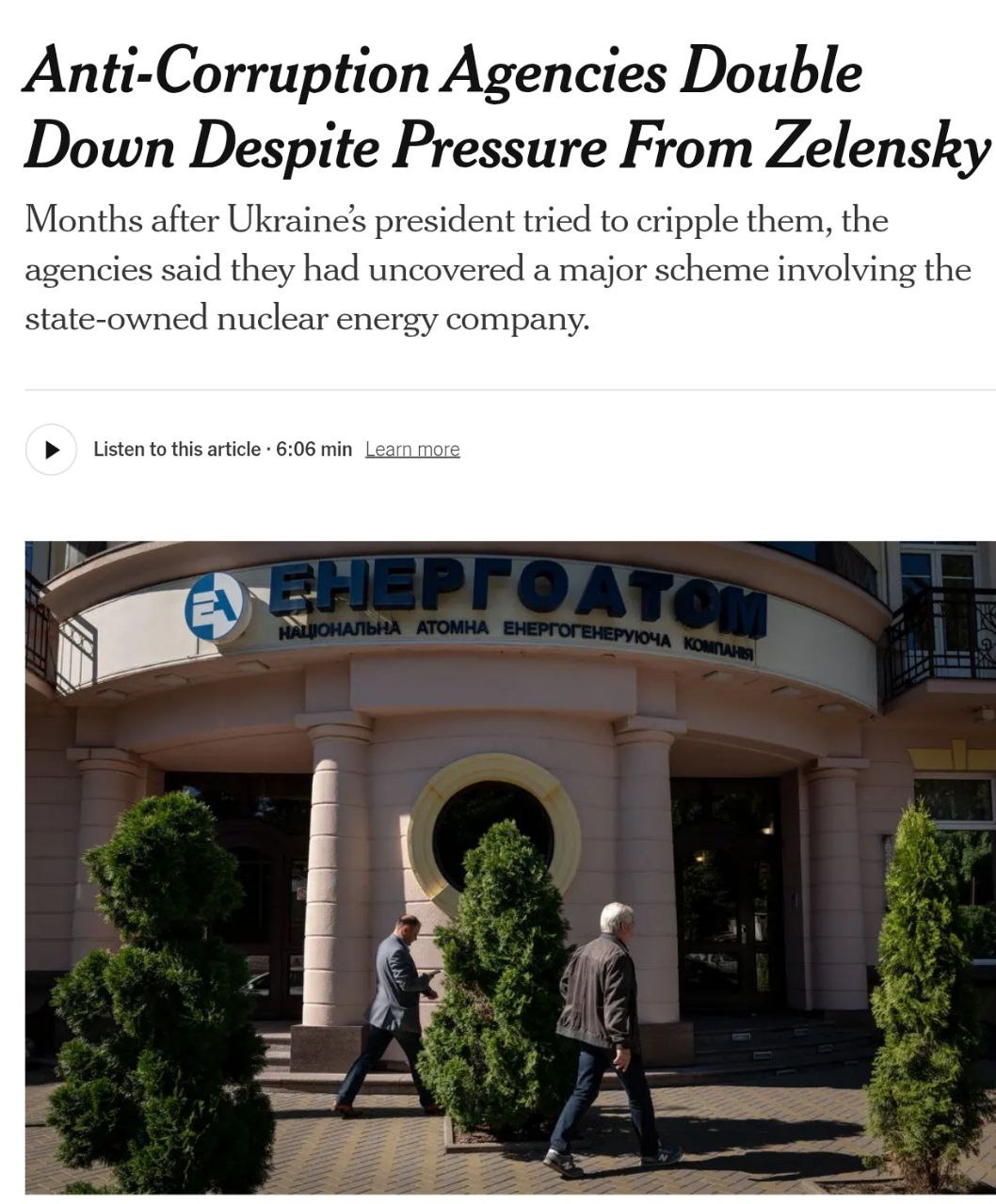 "Г-н Зеленский, избранный президентом в 2019 году, пришёл в политику, пообещав искоренить коррупцию, которая давно преследует Украину. Однако обвинения в инсайдерских сделках и коррупции продолжались и во время его президентства, особенно в энергетическом секторе", - добавляет NYT.