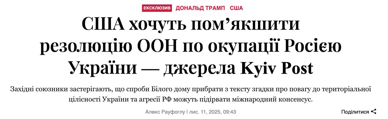 "Это еще один пример того, как Вашингтон отходит от ключевых интересов Украины в решающий момент дипломатии. Если эти формулировки уберут, сигнал Москве будет однозначным: США больше не возглавляют защиту международного порядка", - заявил один из дипломатов.