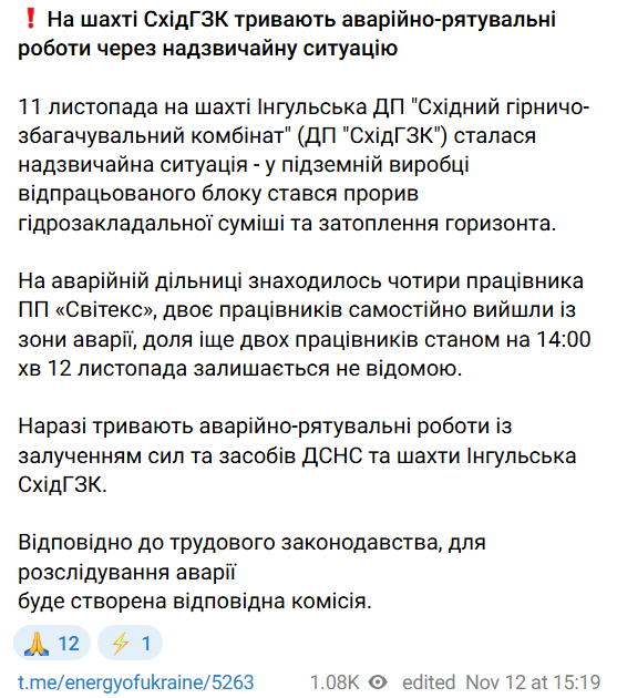 По данным ведомства, 11 ноября на шахте "Ингульская" госпредприятия "Восточный горно-обогатительный комбинат" (ГП "ВостГОК") произошла чрезвычайная ситуация: в подземной выработке отработанного блока случился прорыв гидрозакладочной смеси и затопление горизонта.