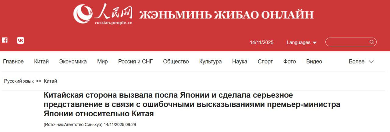 На днях Санаэ заявила, что возможная атака КНР на Тайвань создает экзистенциальную угрозу для Японии, что позволит стране воспользоваться правом на коллективную оборону и призвать на помощь США.