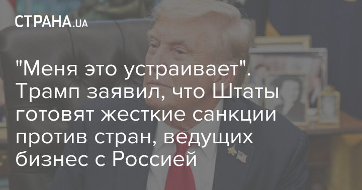 "Я слышал, что они (республиканские конгрессмены - Ред.) занимаются этим, и меня это устраивает. Они принимают законы, то есть республиканцы вносят законопроект, который очень жёсткий: он вводит санкции и так далее против любой страны, ведущей бизнес с Россией. Они могут добавить к этому и Иран, как вы знаете, это я предложил. Так что любая страна, которая ведёт дела с Россией, будет подвергнута очень серьёзным санкциям", - сказал Трамп.