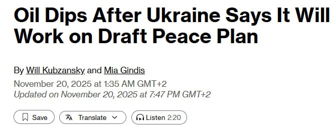 "Зеленский получил сигналы от США о том, что ему следует принять соглашение, разработанное в консультации с Москвой, сообщил источник, знакомый с ситуацией, пожелавший остаться анонимным в связи с деликатным характером вопроса. Президент Дональд Трамп поддерживает этот план, сообщил высокопоставленный американский чиновник", – говорится в публикации.
