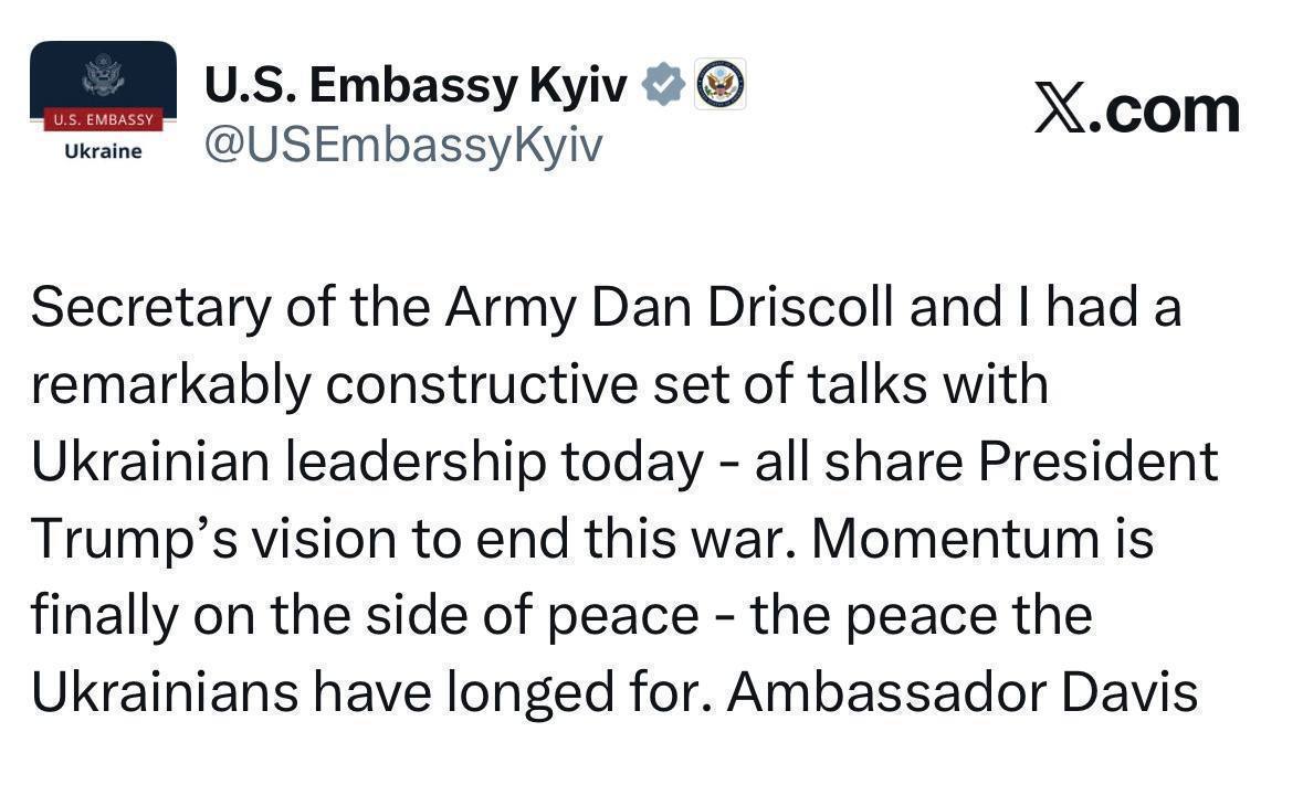 "У нас были чрезвычайно конструктивные переговоры с украинским руководством сегодня – все разделяют видение президента США Дональда Трампа относительно завершения этой войны", – подчеркнула дипломат.