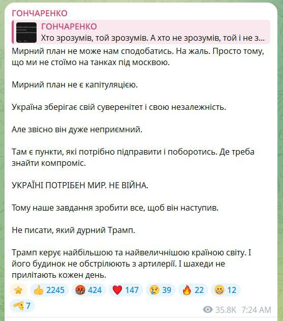 "Мирный план не может понравиться нам. К сожалению. Просто потому, что мы не стоим на танках под Москвой. Мирный план не капитуляция. Украина сохраняет свой суверенитет и независимость. Но, конечно, он очень неприятен. Там есть пункты, которые нужно подправить и побороться. Где нужно найти компромисс. Украине нужен мир, а не война. Поэтому наша задача сделать все, чтобы он наступил. Не писать, какой глупый Трамп. Трамп управляет самой большой и величайшей страной мира. И его здание не обстреливают из артиллерии. И шахеды не прилетают каждый день", - пишет Гончаренко.