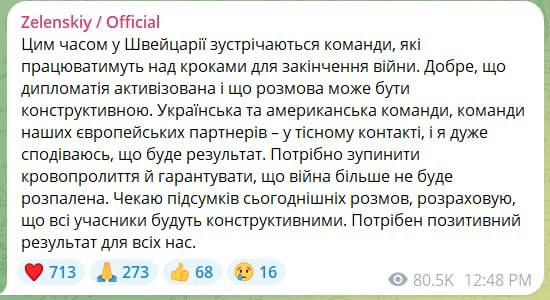 Президент Украины Владимир Зеленский также прокомментировал начало переговоров в Женеве.