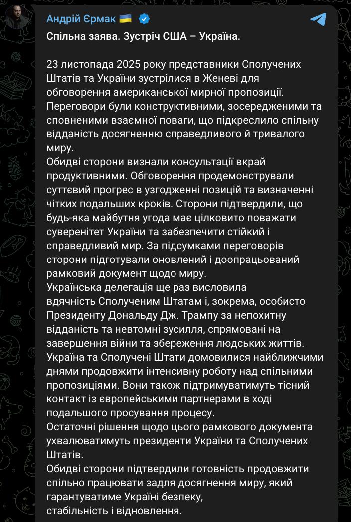 "23 ноября 2025 года представители Соединённых Штатов и Украины встретились в Женеве для обсуждения американского мирного предложения. Переговоры были конструктивными, сосредоточенными и исполненными взаимного уважения, что подчеркнуло общую приверженность достижению справедливого и длительного мира.