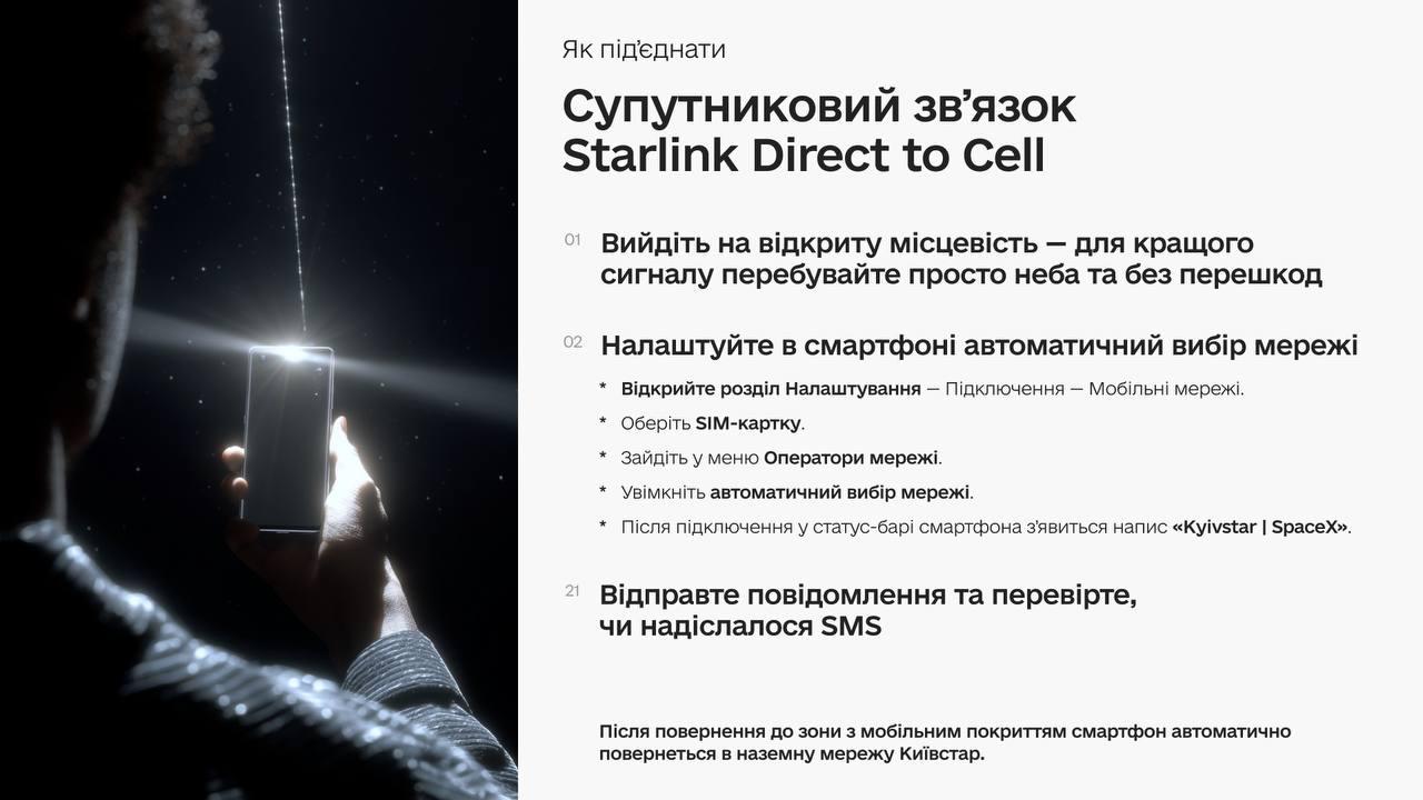 Для подключения услуги Starlink Direct to Cell необходимо выйти на открытое пространство и настроить в смартфоне автоматический выбор сети, после чего устройство автоматически подключится к спутниковой сети "Kyivstar-SpaceX".