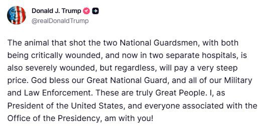 "Животное, которое ранило двух нацгвардейцев, заплатит очень высокую цену", – прокомментировал инцидент президент США Дональд Трамп.