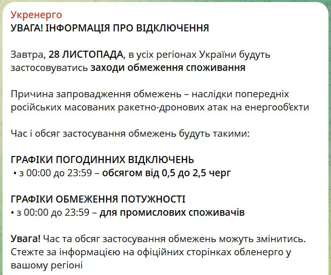 18.09 Отключения света завтра будут во всех регионах – круглосуточно в объеме от 0,5 до 2,5 очередей, сообщает "Укрэнерго".