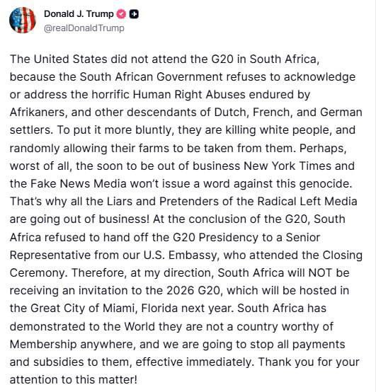 "Соединенные Штаты не присутствовали на саммите G20 в Южной Африке, потому что правительство Южной Африки отказывается признавать или решать ужасающие нарушения прав человека, которым подвергаются африканеры и другие потомки голландских, французских и немецких поселенцев. Если говорить более прямо, они убивают белых людей и беспорядочно позволяют отнимать у них фермы. Возможно, хуже всего то, что скоро обанкротившаяся The New York Times и фейковая новостная пресса не скажут ни слова против этого геноцида. Вот почему все лжецы и притворщики из радикально левых медиа разоряются! По завершении саммита G20 Южная Африка отказалась передать председательство в G20 старшему представителю нашего посольства США, который присутствовал на церемонии закрытия. Следовательно, по моему указанию, Южная Африка не получит приглашение на G20 2026 года, который в следующем году будет проводиться в великом городе Майами, Флорида. Южная Африка продемонстрировала миру, что она не является страной, достойной членства где бы то ни было, и мы немедленно прекращаем все выплаты и субсидии им", – написал президент США.